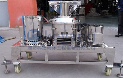 物料由加料系統(tǒng)均勻的送入粉碎室受到高速旋轉(zhuǎn)的粉碎盤的強烈沖擊,同時受到離心力的作用,與粉碎齒圈發(fā)生碰撞,受到剪切、摩擦、碰撞等多種綜合力的作用,使物料粉碎,被粉碎的物料隨氣流運動到分級區(qū),通過變頻調(diào)節(jié)的分級輪,對粗細物料進行分離,符合細度要求的產(chǎn)品隨氣流進入旋風收集器和除塵器收集,粗物料返回分級區(qū)二次粉碎。