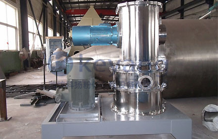 ※ 機(jī)體內(nèi)腔為園筒形,上部份為超微分級(jí)機(jī),下部分為超微粉碎機(jī)。粉碎室由粉碎盤和磨塊組成,用來(lái)將物料擊碎成細(xì)粉,分級(jí)室由分級(jí)葉輪組成,能把細(xì)粉分成粒度達(dá)標(biāo)品和未達(dá)標(biāo)品兩種規(guī)格,達(dá)標(biāo)品經(jīng)出料管排出,由旋風(fēng)集料器收集。未達(dá)標(biāo)品沿腔體內(nèi)壁回落到粉碎室,繼續(xù)粉碎直到達(dá)標(biāo)為止。